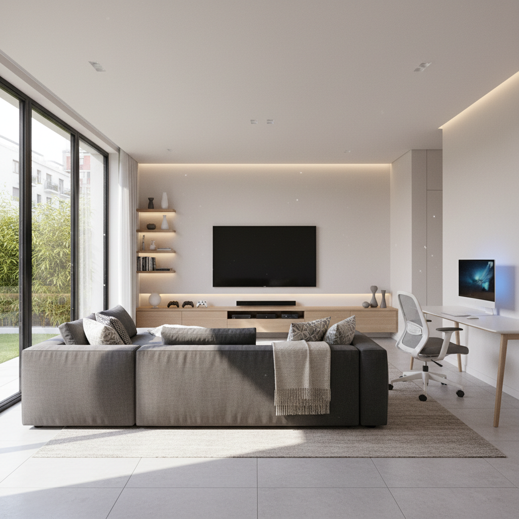 Follow @techranj.livingMinimalist living room meets smart home technology. Clean lines, hidden cables, perfect harmony.